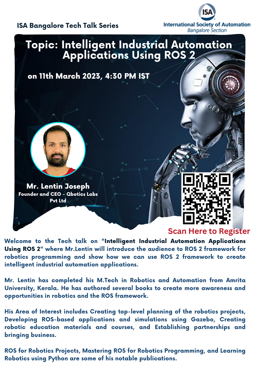 On behalf of the ISA Bangalore section, I welcome you to the Tech talk on "Intelligent Industrial Automation Applications Using ROS 2," where Mr.Lentin will introduce the audience to ROS 2 framework for robotics programming and show how we can use ROS 2 framework to create intelligent industrial automation applications.