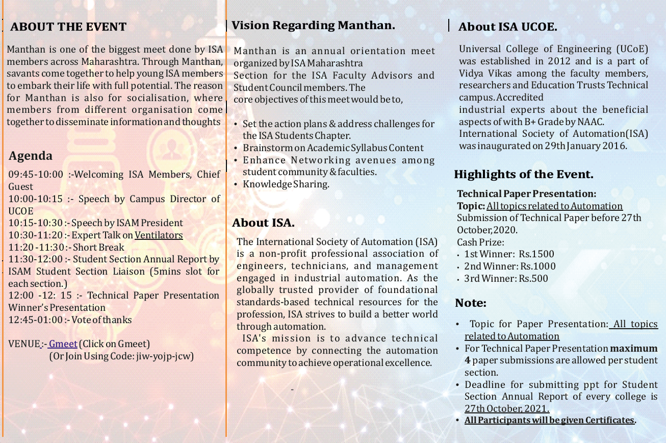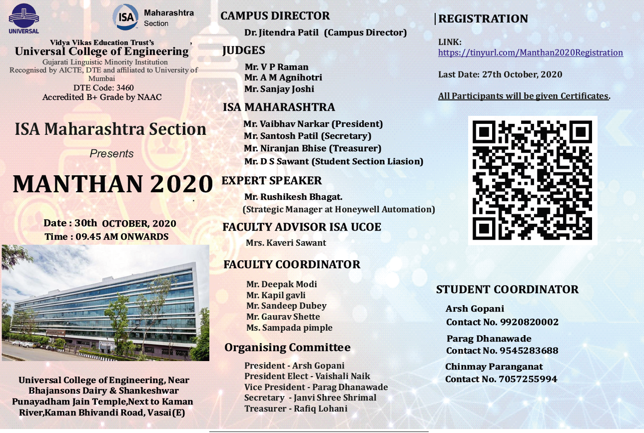 On behalf of ISA Maharashtra Section , I personally invite you for Manthan 2020 - an annual orientation meet organized by ISA Maharashtra Section for the ISA Faculty Advisors and Student Section Leaders.